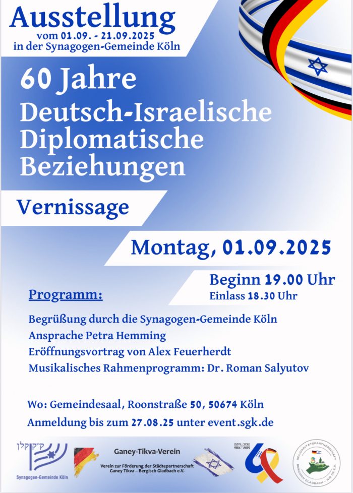 es ist uns eine Ehre und Freude, Sie und Euch zur Vernissage in die Synagoge Roonstraße in Köln einzuladen. Wir freuen uns, dass die Synagogengemeinde Köln die von uns konzipierte Ausstellung in ihren Räumlichkeiten zeigen wird. Die Einladung ist dieser Mail beigefügt. Die Anmeldung muss über dieses Portal bis zum 27.8.25 vorgenommen werden: event.sgk.de