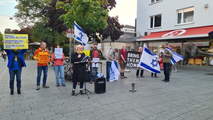 Bei der Mahnwache am 30. September in Bergisch Gladbach kam es zweimal zu bedrohlichen Situationen. Eine junge Frau mit Kind an der Hand stürmte auf Petra Hemming, die am Mikrofon stand und die Namen der Geiseln verlas, zu und brüllte ihr ins Gesicht, dass es kein Israel gäbe, es gibt nur Palästina!