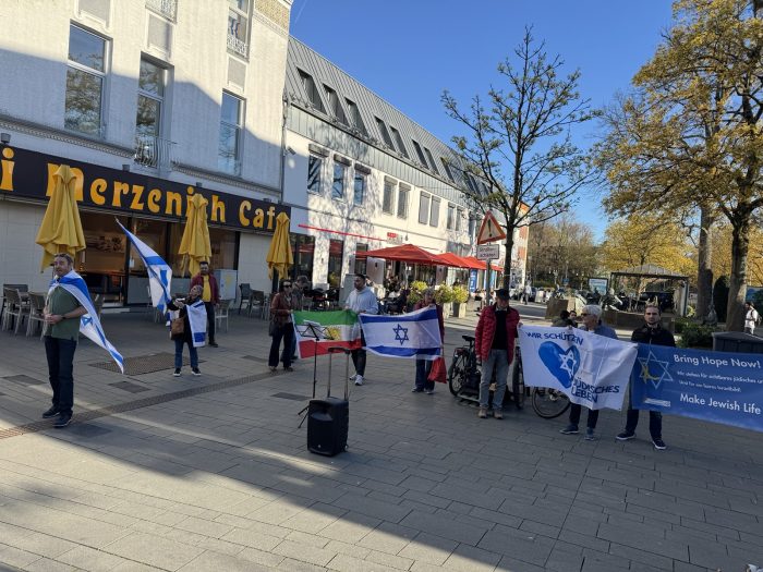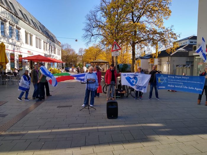Zweieinhalb Jahre nach diesem schrecklichen Tag haben wir die Namen derer verlesen, die am 7. Oktober von den Terroristen der Hamas ermordet wurden. Als erste nannten wir die junge Frau aus Verden bei Bremen: Carolin Bohl wurde am 7. Oktober gemeinsam mit ihrem Freund Danny in ihrem Haus in Nir Oz von Terroristen erschossen. Viele der Ermordeten wurden als Leichnam nach Gaza verschleppt und erst zwei Jahre später an Israel zurückgegeben. Wir haben in der Fußgängerzone spontan Unterstützung von Kurden bekommen, die sich zu uns stellten und mit uns sprachen. Ein junger Mann, der obszöne Gesten in unsere Richtung machte, wurde von der Polizei des Platzes verwiesen. Wir machen weiter, werden nie vergessen und verzeihen. Am 12. Mai findet die nächste Mahnwache statt.