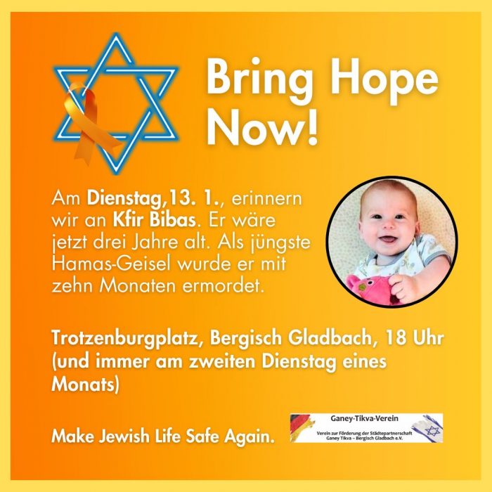 Wir werden diesen Tag würdig und angemessen begehen. Am frühen Morgen des 7.10.25 um 6:56 h werden wir uns in der Innenstadt von Bergisch Gladbach treffen und eine Schweigeminute für die 1200 Opfer des Überfalls abhalten.