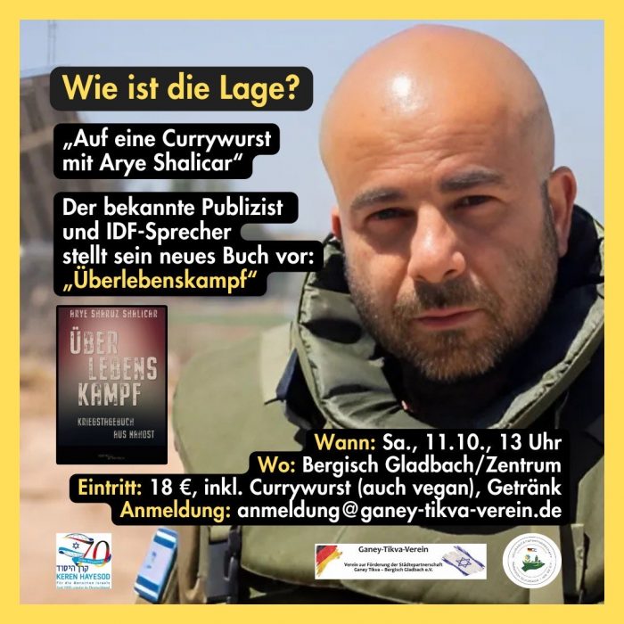 wir freuen uns, dass unser Freund Arye Sharuz Shalicar erneut nach Bergisch Gladbach kommt. Gemeinsam mit Keren HaYessod (offizielle Sammel-organisation zur Unterstützung der Menschen Israels) laden wir zu einem besonderen Format ein: „Auf eine Currywurst mit Arye Shalicar“ treffen wir uns am 11.10.23 um 13:00 h mit Arye in Bergisch Gladbach.
